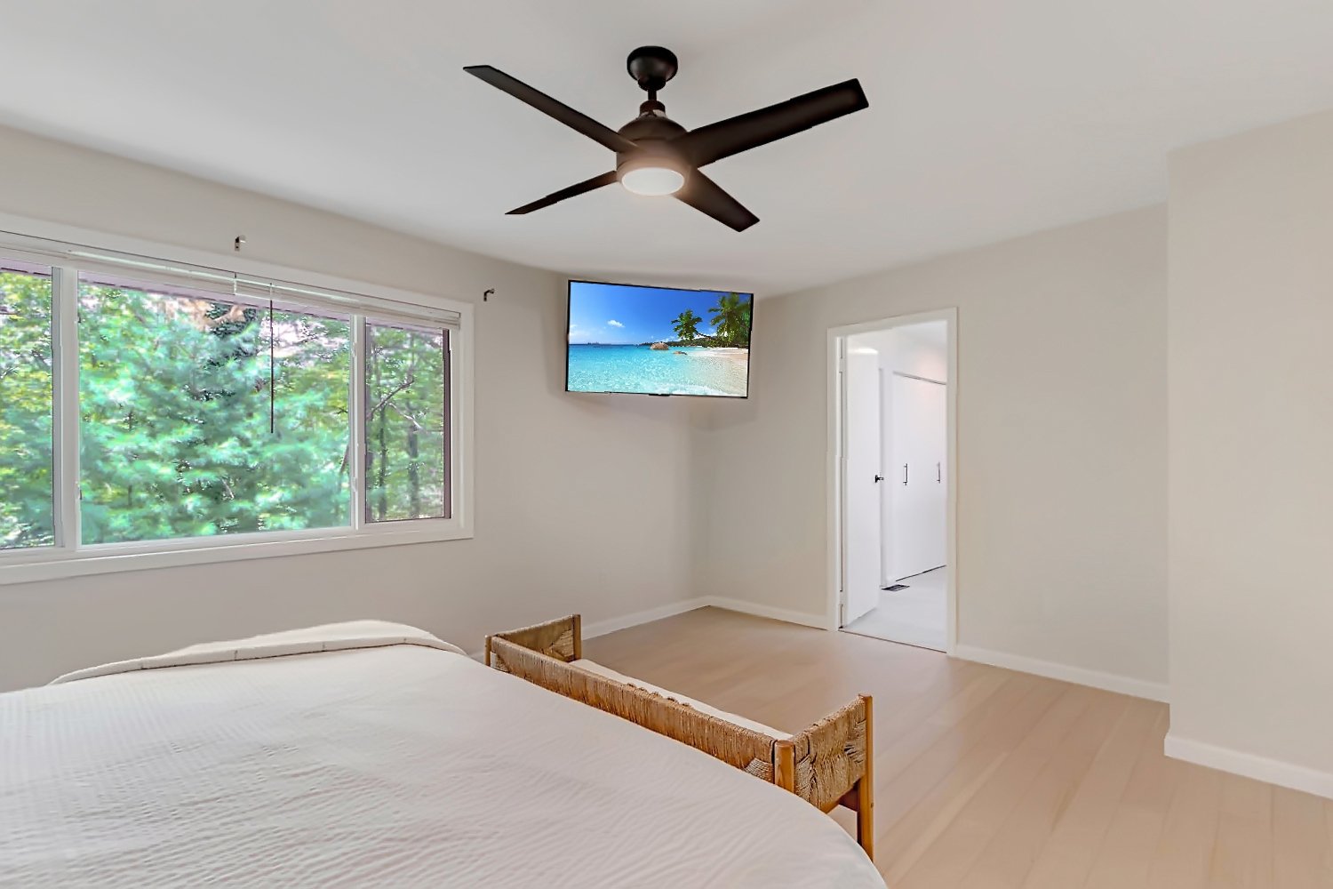 Relax in the master with premium linens and your own TV — perfect for late-night movies or game-day highlights