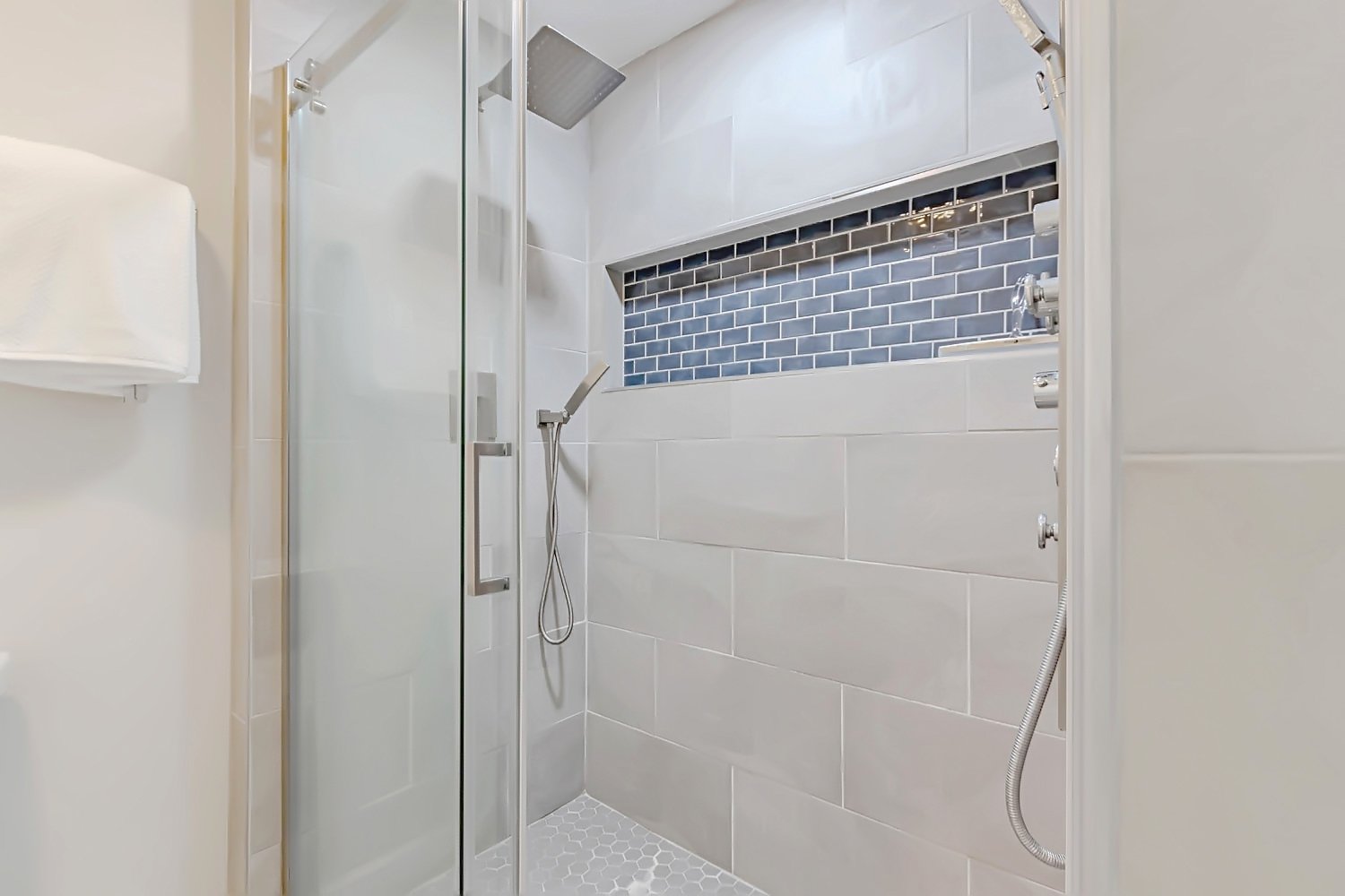 Bright, clean master bath with walk-in shower and double vanity — perfect for a relaxing stay